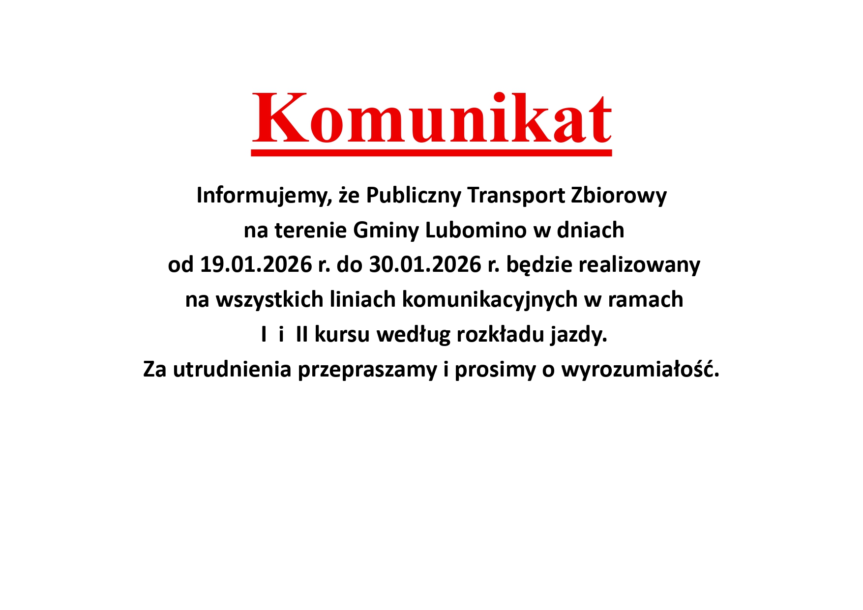 Komunikat Informujemy, że Publiczny Transport Zbiorowy na terenie Gminy Lubomino w dniach od 19.01.2026 r. do 30.01.2026 r. będzie realizowany [...]