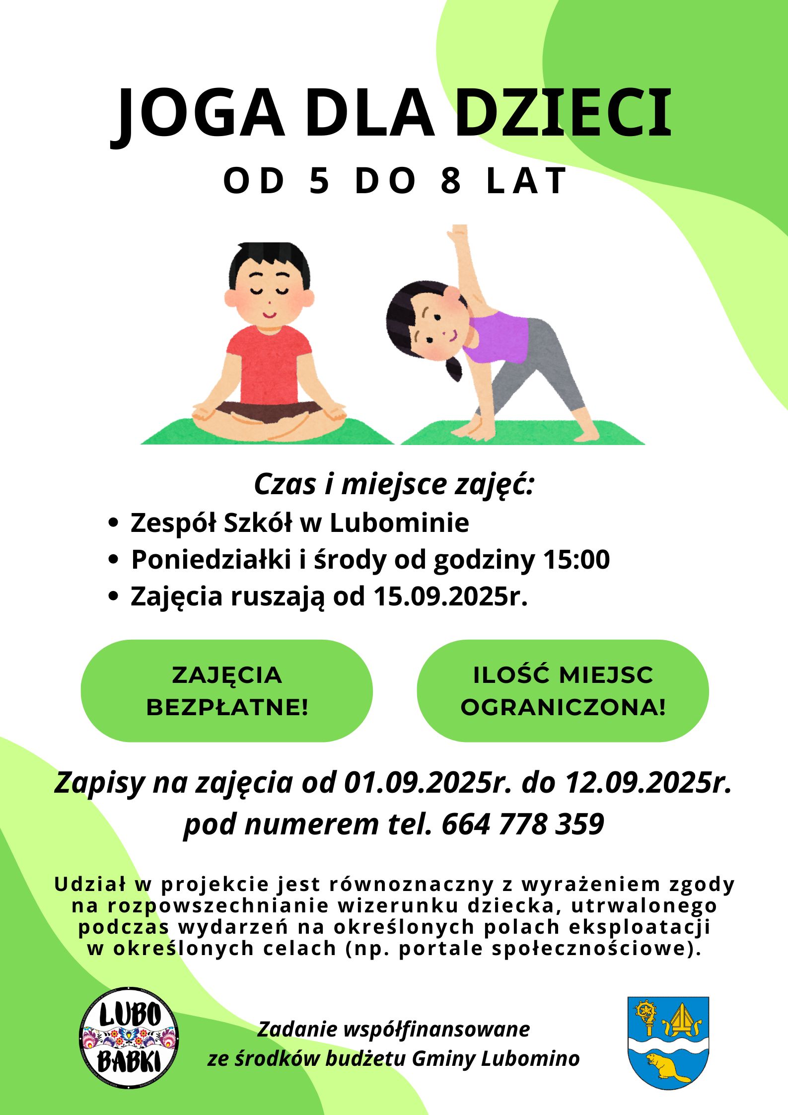 KGW Lubobabki zaprasza na bezpłatne zajęcia jogi dla dzieci w wieku 5 – 8 lat. Zadanie współfinansowane ze środków budżetu Gminy Lubomino.