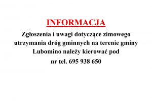 ZGŁOSZENIA I UWAGI DOTYCZĄCE ZIMOWEGO UTRZYMANIA DRÓG GMINNYCH NA TERENIE GMINY LUBOMINO Anna Szerszeń2025-12-30T07:29:13+01:0030 grudnia, 2025|Aktualności|